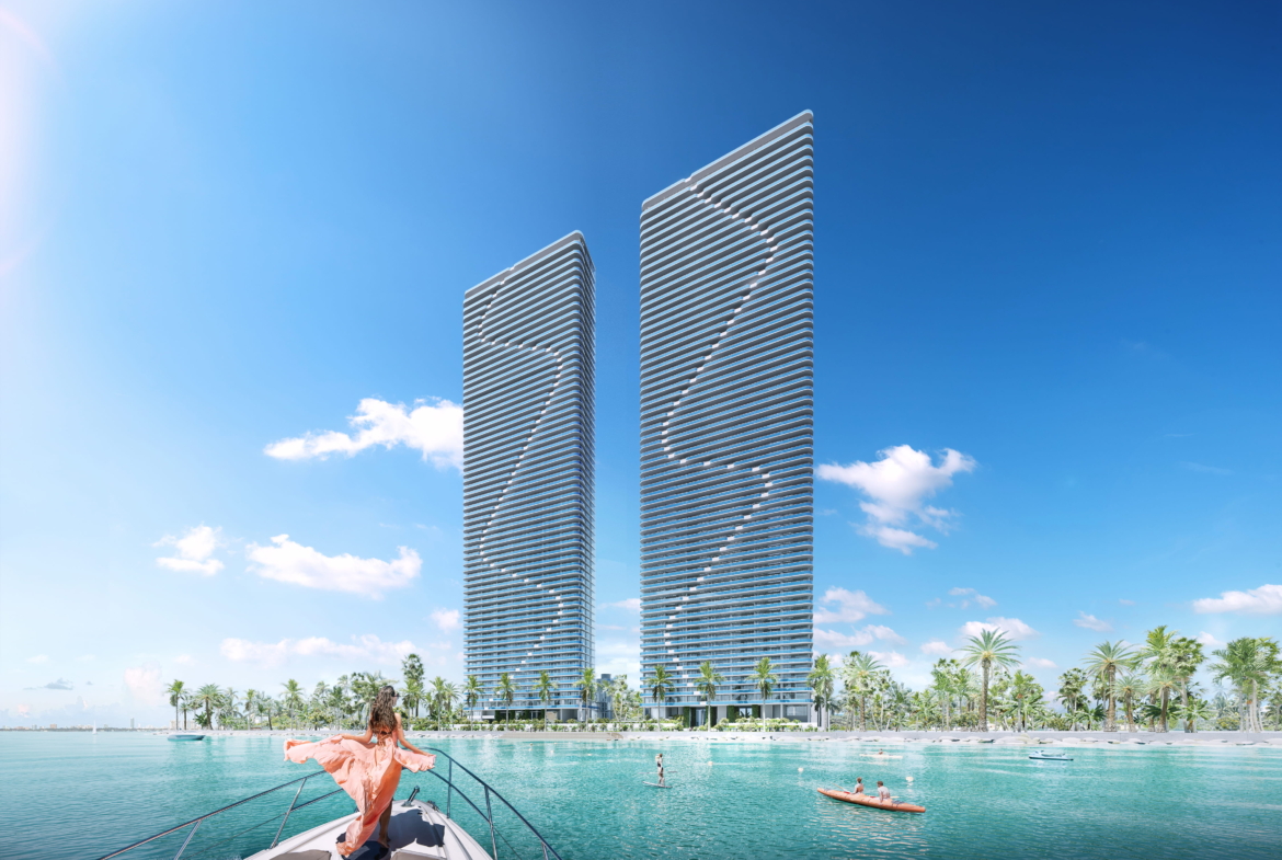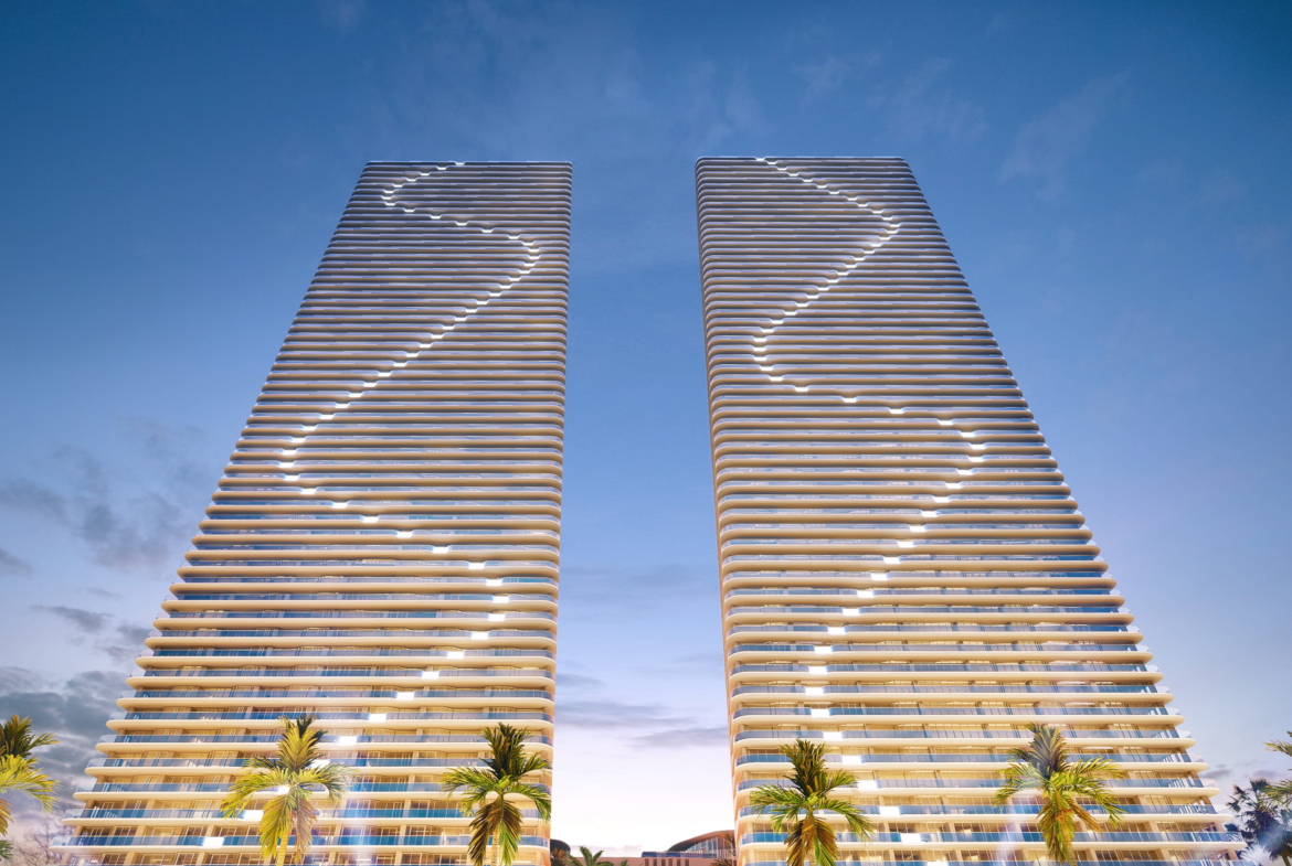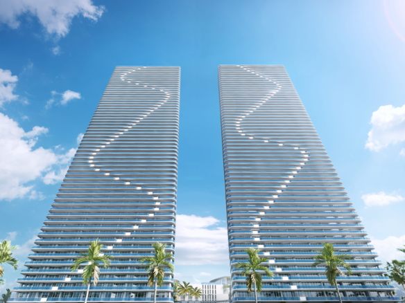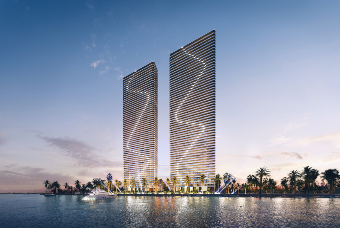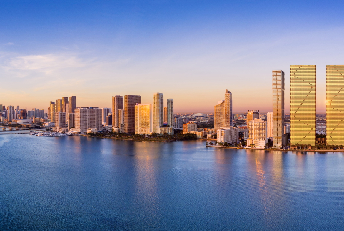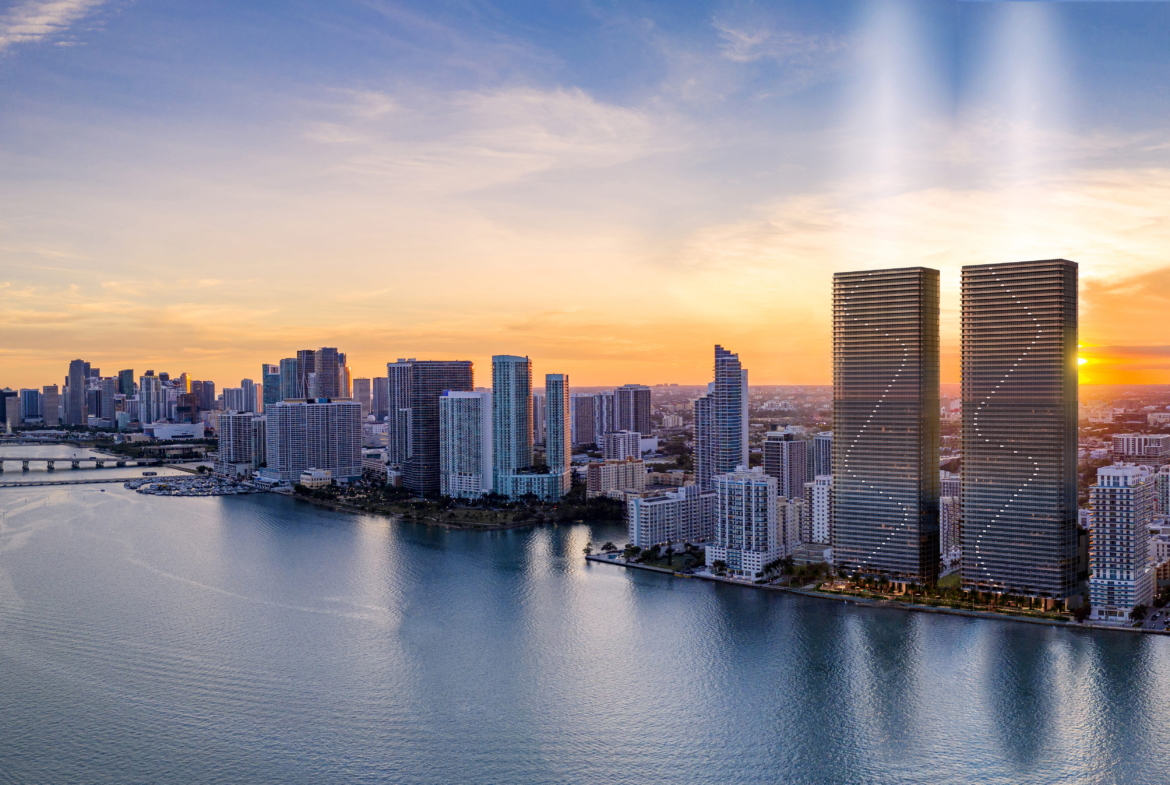 - Twin towers rising over 60 stories on Biscayne Bay
