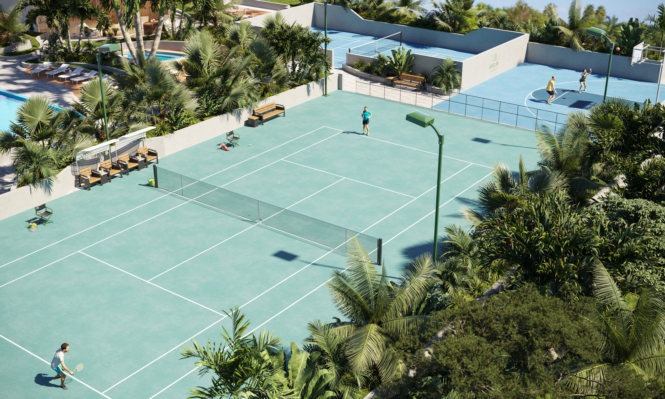 - Tennis, paddle, and basketball courts